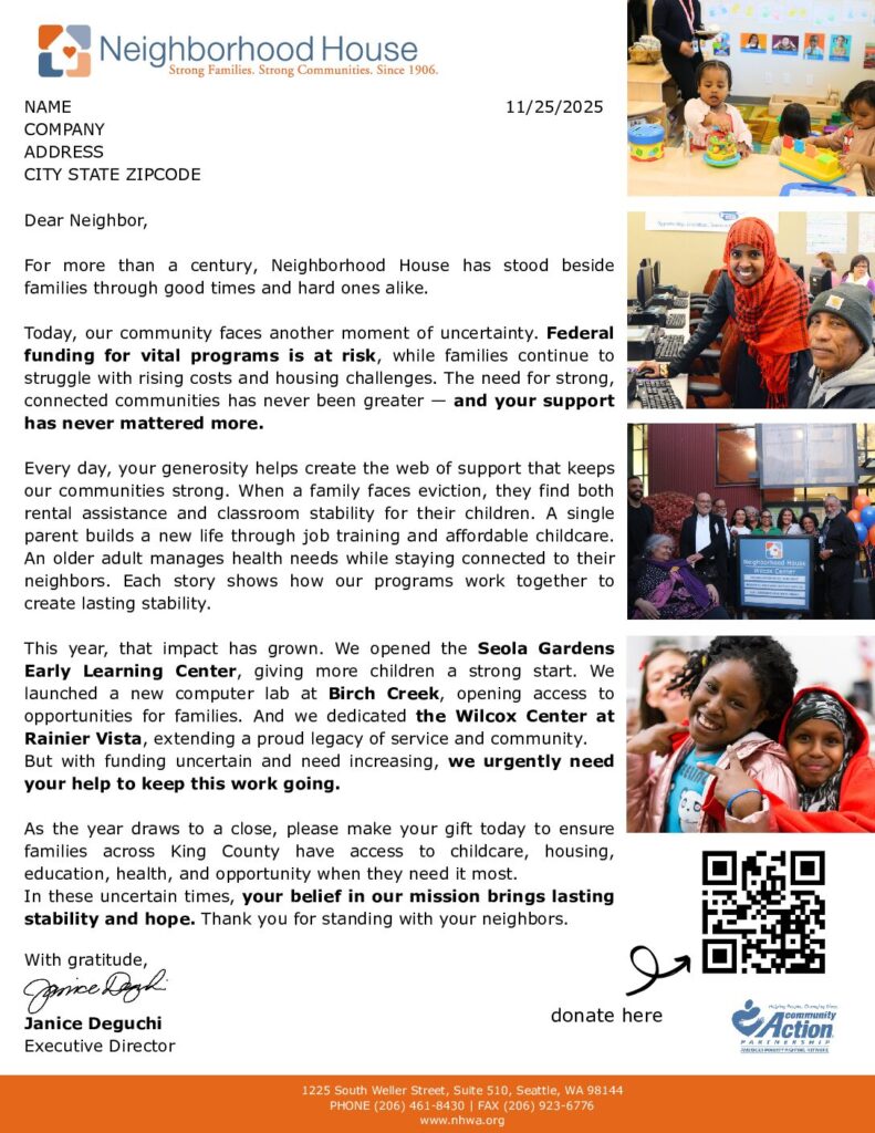 In just a few days, staff from multiple Neighborhood House programs came together to act. Our Housing Stability team found emergency funding to cover back rent, teachers stayed in close contact to ensure the children’s learning wasn’t disrupted, and care coordinators connected the family with ongoing support to keep them stable long after the crisis passed.
